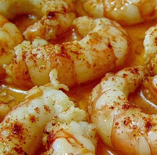 Los gambones a los Jardines con sus huevos fritos para romper y su fondo de patatas panaderas 18,00 €