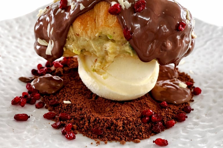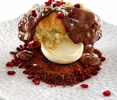 -Sol de los jardines de bola de helado de la casa metida en hojaldre bañado con nutela templada y picada de frutos secos 8€