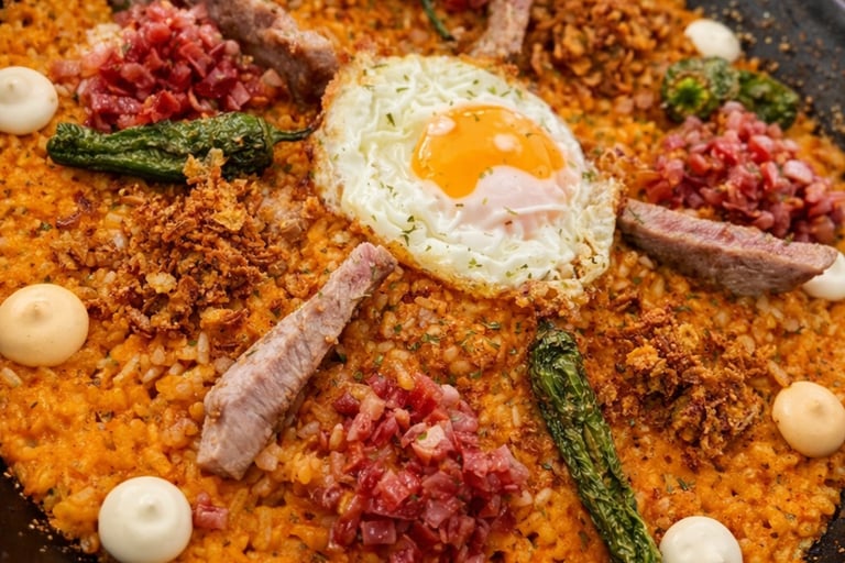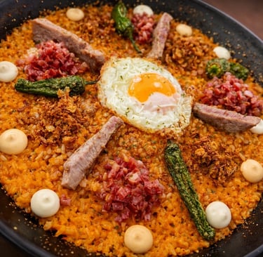 Gulas al ajillo con jamón y su huevo frito de oro 19,00€